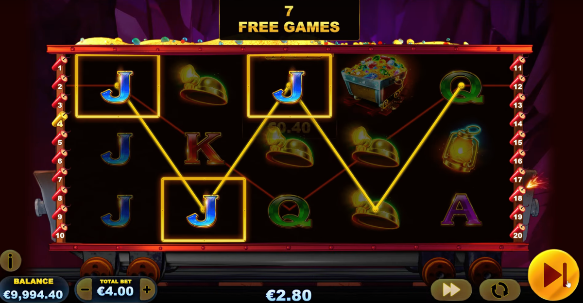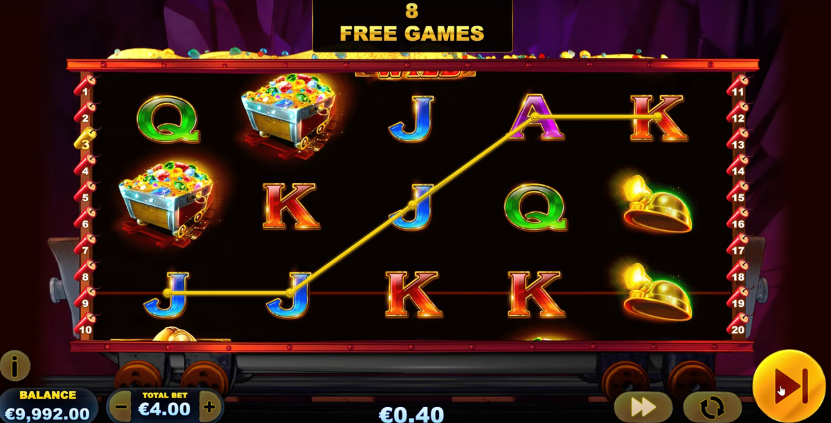 The symbols that pay less money are J, Q, K and A. If you get a 5-of-a-kind win with those symbols, you will get between 4X and 5X your bet. The symbols that pay more money are helmet, lamp and wagon. Those will give you between 7.5X and 12.5X your bet. The Wild Symbol can take the place of any other symbol and it also wins a prize. It gives you 15 times your bet if you get 5 Wild Symbols in a row. The Wild Symbol does not work for the Scatter Symbol or Diamond Nugget during Free Spins.