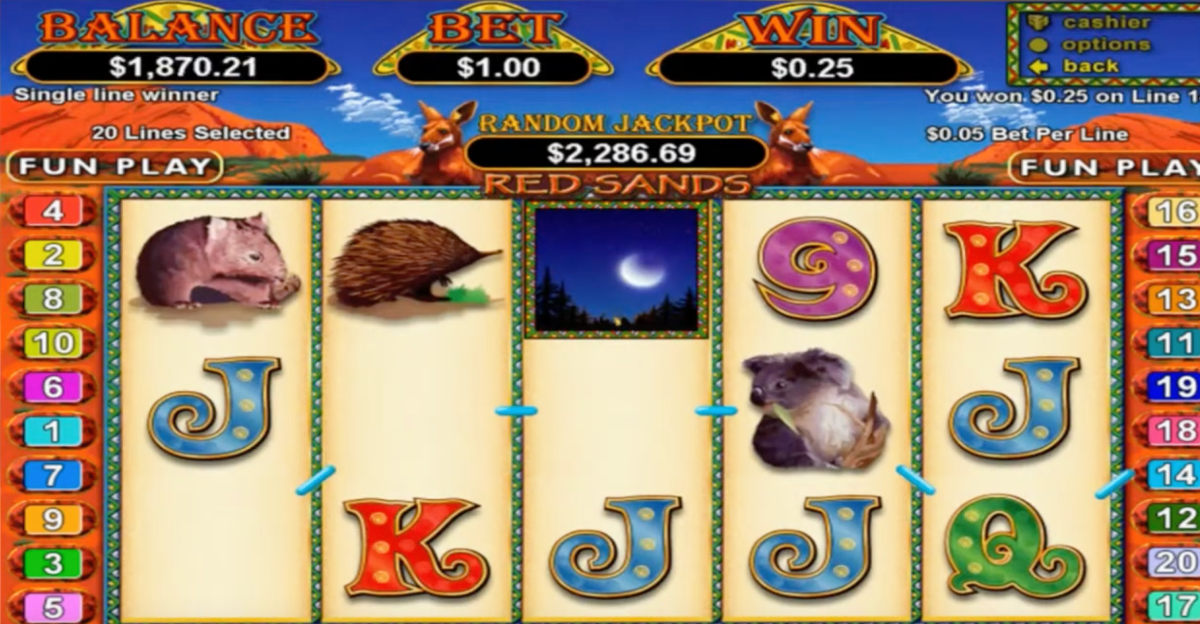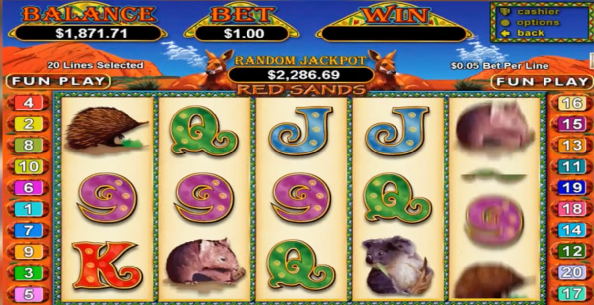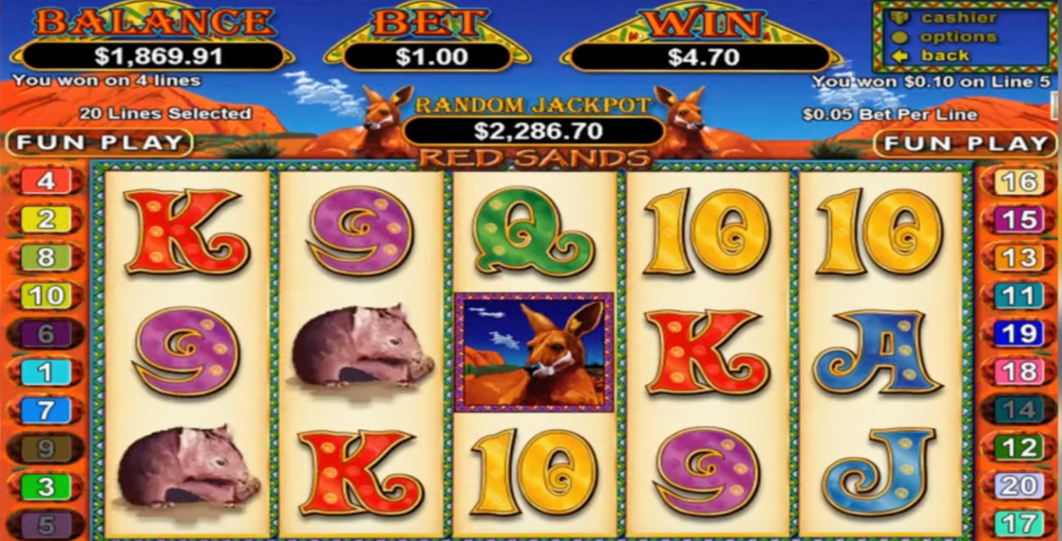 Red Sands slot machine is a casino game powered by real-time gaming software. The theme of the slot machine is about Austrian wildlife. When playing Red Sands, you will find four unique symbols which all enable you to do different things. There is the Kangaroo, Moonscape, Koala, and Wombat.
