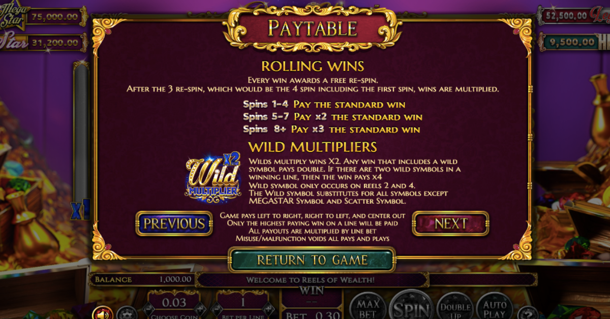 The way you win playing the reels of wealth pokies is by matching symbols together. Each of the symbols has different values, and there are wild symbols. These sticky wilds replace your icons to form winning combinations. The symbols you will see are bags of gems, wads of cash, gold bars, gold coins, scatter (vault), treasure chests, and blue, green and red gemstones. Also, there are poker playing cards from the Jack to the Ace. The Megastar Jackpots and regular Star jackpots are key to winning money and Bitcoin.