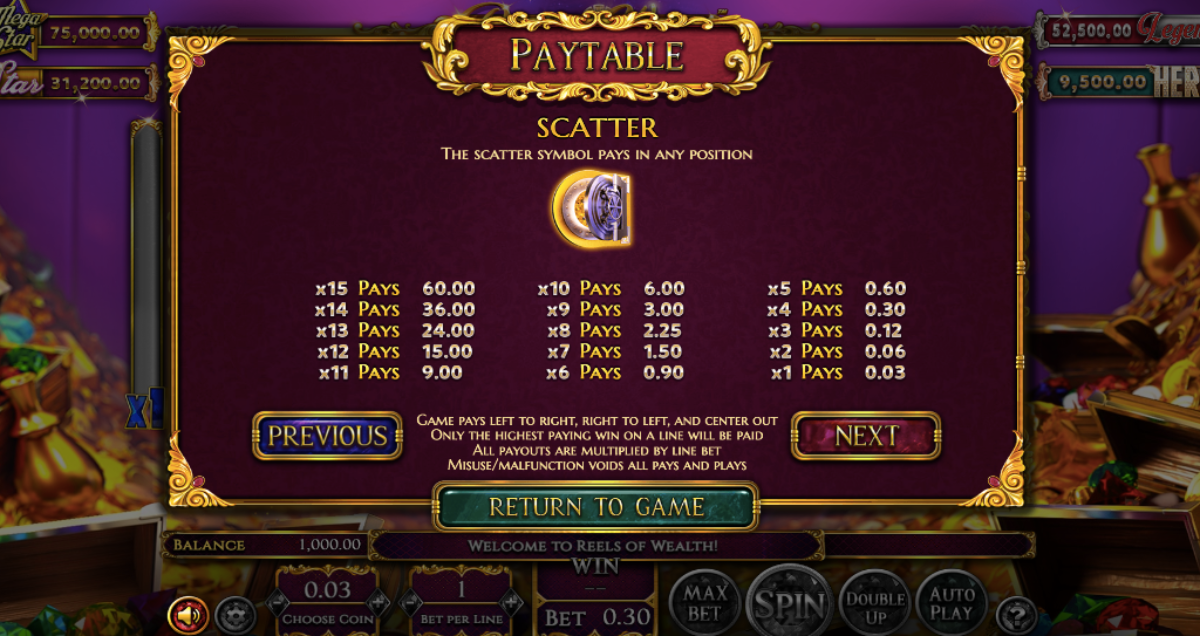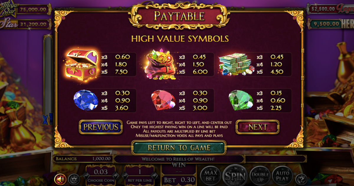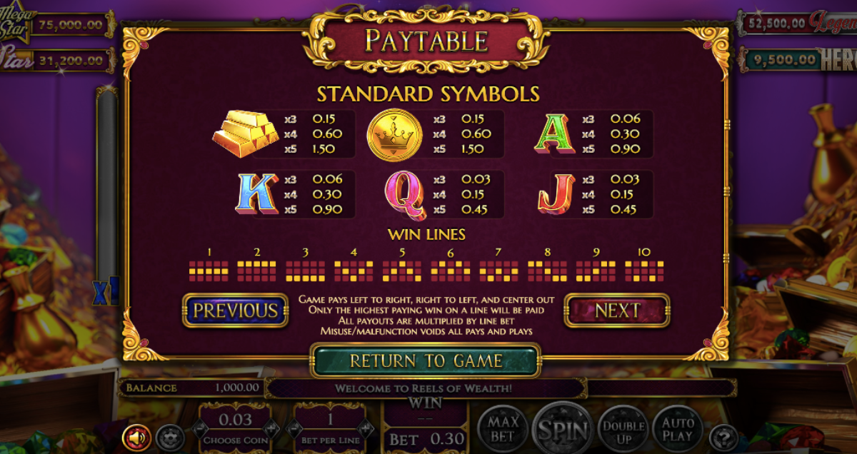 Reels of Wealth has a vast betting range. Also, the coin denominations start at one cent and go up to one hundred dollars per spin. The way to bet one hundred dollars per spin is to put ten coins on all ten pay lines. The low-value symbols pack a good punch. Above all, the best cash prize is 67,400 coins besides the progressive jackpot.