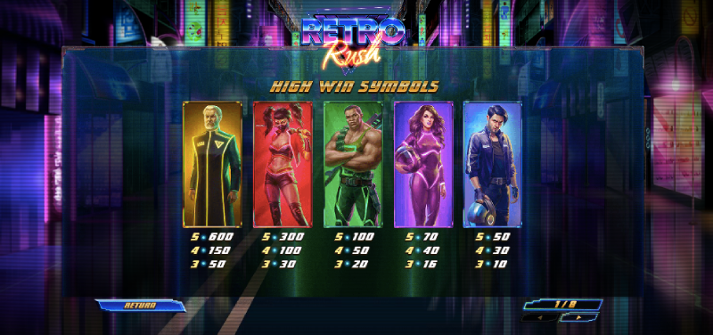 The Retro Rush slot game is set in a city that looks like it comes from the future. You will see bright lights and you can hear a music that sounds like it came from an electronic machine. On the reels, you will see A, K, Q, J and 10 symbols. There are also 5 characters to watch out for. The white-haired character gives you 20 times your bet if you get 5 of them in a row.