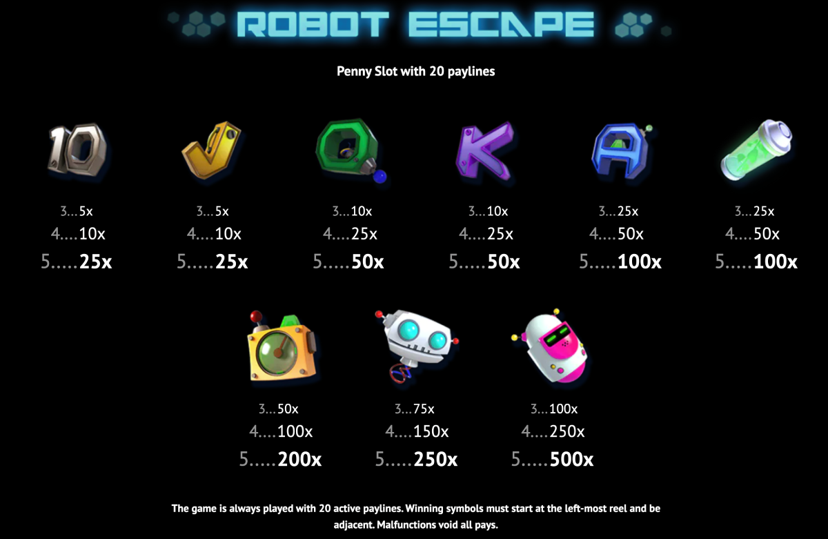 Robot Escape is a penny slot machine and has amazing graphics as your spin the reels and obtain some intergalactic winnings.