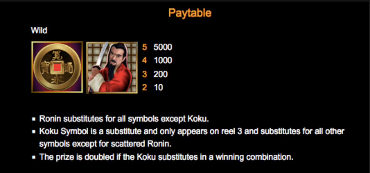 The Koku icon is the wild symbol in Ronin. Keep your eye out for that because when you land a Koku wild symbol on the reels, they will substitute for all the other symbols except the scatter symbol. The Koku Wild symbol will appear in the third reel. It will also double the number of payouts when you land a winning combination.