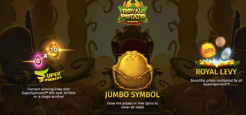 Teardrop-shaped SuperSpinners are positioned between reels and hold random values for the win multiplier. When a winning combination passes over a SuperSpinner, the prize is increased. A row of nine SuperSpinners is worth 9,000 spins. When the result is revealed, each value pays out one after another. If you combine King and Queen potatoes with SuperSpinner values, you’ll get random prizes that match the outcome.