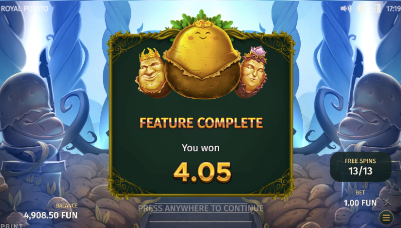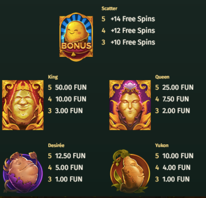 On the reels of Royal Potato, you’ll find three, four, or five baby potato scatter symbols and a free spins feature will activate. A 2×1 sticky symbol appears in the middle of the reels and may be used to substitute for any other depicted in a panel to the side of the game.