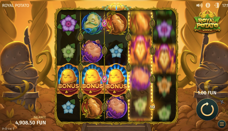 The Royal Potato is a 5Ă—5 slot developed by Print Studios that may be played at several of the top online casinos. The backdrop is beautiful, with five cartoon potato symbols scattered across the five reels and 30 paylines.