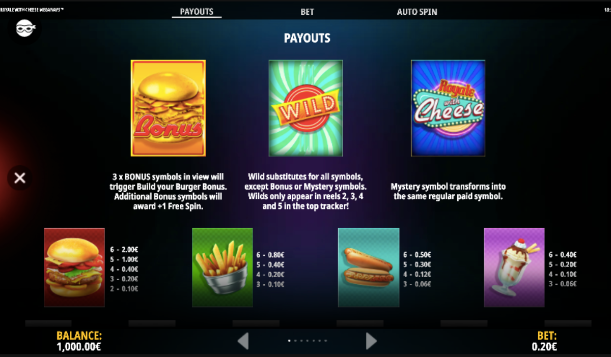 As for the statistics, you can expect an iSoftBet game with Royale with Cheese Megaways game to have stats that are similar to those found in the most recent releases by the developer. The slot machine offers a range of bets from 0.2$ to 20$. The higher the bet, the more likely you will win. It is very volatile and your reward will be around 96%. With Royale with Cheese Megaways, you can win up to 1 million coins on a single spin. In other words, it can payout 50,000 times what you bet.