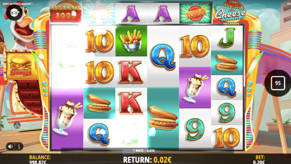 Instead of talking about McDonald’s, let’s talk about the Royale with Cheese Megaways slot. It has a different setting compared to McDonald’s. This game is set inside an American diner with a 50s feel to it. It is light-hearted and colorful. The place with the food has a bunch of grids and a chicken peeking out. You can win up to 117,649 ways on each spin, but you have to play the game for that to happen.