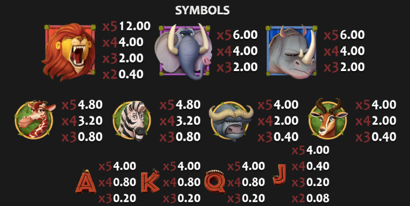 The premium symbols are a group of safari animals including lions, elephants, and rhinos. The highest paying symbol is the lion.After that, the higher-paying symbols are the giraffe, horned animals and zebras. The other symbols are the standard low-paying ones, like Ace, King, Jack, and Q. You’ll earn rewards from left to right.