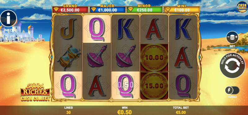 Saharah Riches Cash Collect has four different prizes. If you get a Cash Collect symbol on the fifth reel and any diamond symbol, then you could win one of four jackpots – Mini, Minor, Major or Grand.