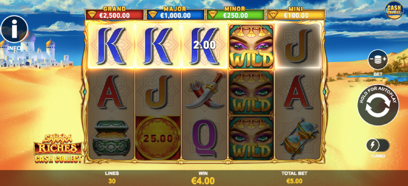 Saharah Riches Cash Collect has four different prizes. If you get a Cash Collect symbol on the fifth reel and any diamond symbol, then you could win one of four jackpots – Mini, Minor, Major or Grand.