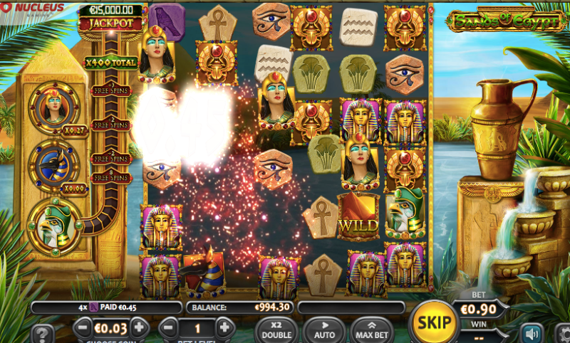 Sands of Egypt, the cascading slot from Nucleus Gaming, is a must-play for any player looking for the best video slots. You will find Cluster Pays and Exploding Wins as well as free spins with the Ra. Isis trails, and Anubis. Also, if you land twenty of more of the Isis,Anubis, or Ra symbols you will score big wins.
