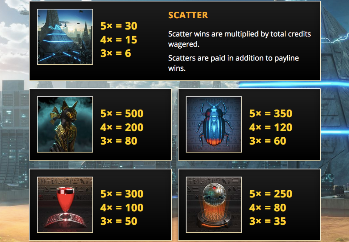 The Cityscape is also the Scatter symbol. When you land three or more of the Cityscape scatter, you will multiply your wins by the amount of credits you are wagering.