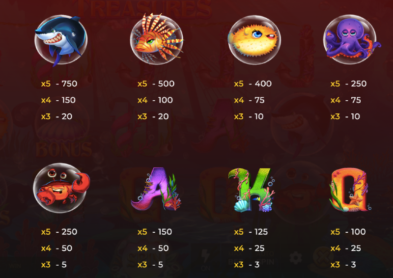There are several things in Sea Treasures you should pay attention to, starting with pearl symbols that serve as the game’s scatters. If you find three or more pearl symbols on the shell, you will get five free spins. If the shell has two or three pearls, you will get one or two extra spins. The free spins can keep happening, and every new pearl symbol will add an extra spin.