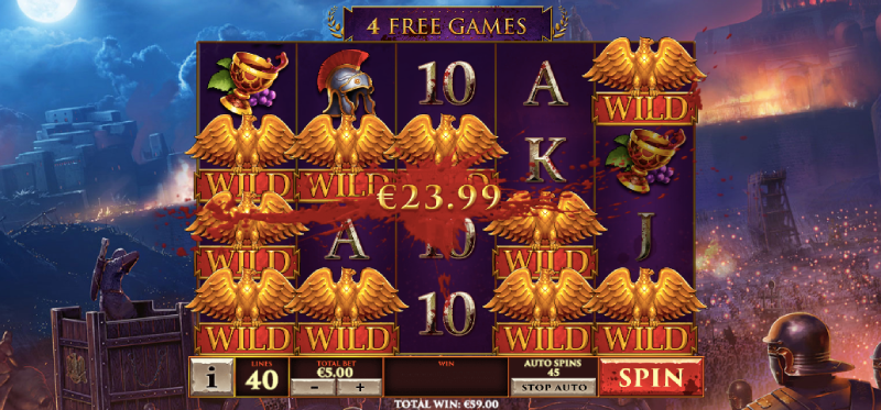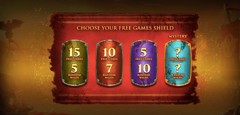 In the game Shields of Rome, after every 10 spins a Wild Fire Spin will happen. If you get a special symbol called S.P.Q.R on one spin, it will be marked with fire and then on your 10th spin all positions marked with fire will become wild for that spin. There is also a golden eagle wild which appears only during this feature and it can replace any symbol except bonus and special symbols – if you get 5 across the payline you win 8 times your stake!