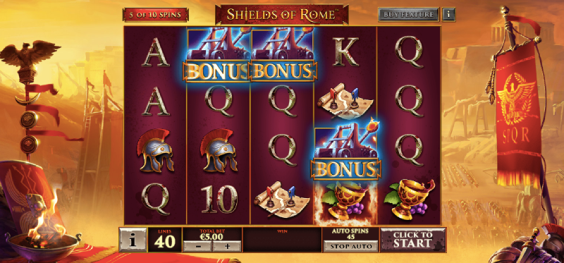 In the game Shields of Rome, after every 10 spins a Wild Fire Spin will happen. If you get a special symbol called S.P.Q.R on one spin, it will be marked with fire and then on your 10th spin all positions marked with fire will become wild for that spin. There is also a golden eagle wild which appears only during this feature and it can replace any symbol except bonus and special symbols – if you get 5 across the payline you win 8 times your stake!
