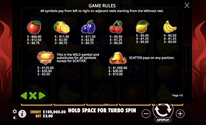 Normally, we’d go through all of the features of a slot in this part. Although there are no specific features on Shining Hot 40, you may use its Autoplay option to speed things up. Simply select your stakes, the number of desired spins, and how quickly you want it to happen!