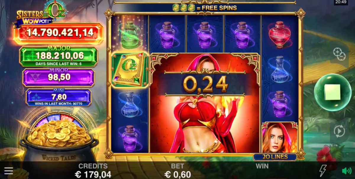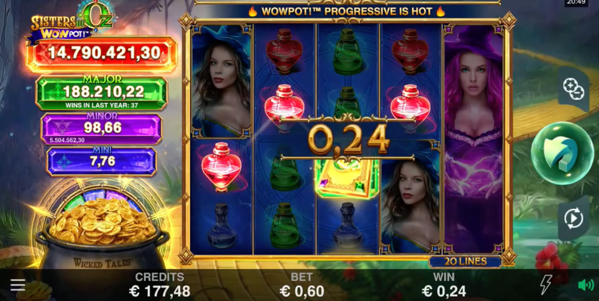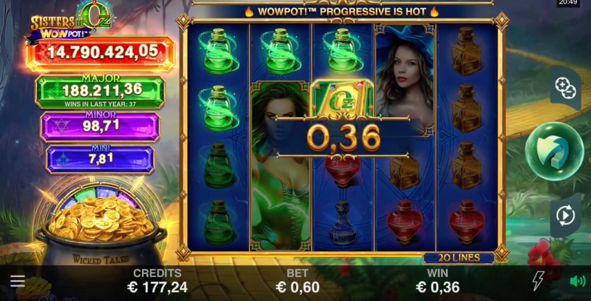 WowPot Jackpot, the main attraction of the game, is the progressive jackpot that is randomly triggered on a spin that lands a gold Oz symbol on top of the magic potion icon. Once triggered, this feature takes you to the spinning wheel where you’ll find out which one of the four potential jackpot prizes you’ve won – mini, minor, major, or the WowPot which starts at 2 million.