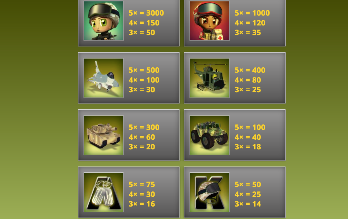 Keep your eyes open for the Artillery soldier, as the Artillery soldier symbol is the scatter symbol and the bonus symbol in this casino slot game. There is a second scatter and bonus symbol that you need to look out.