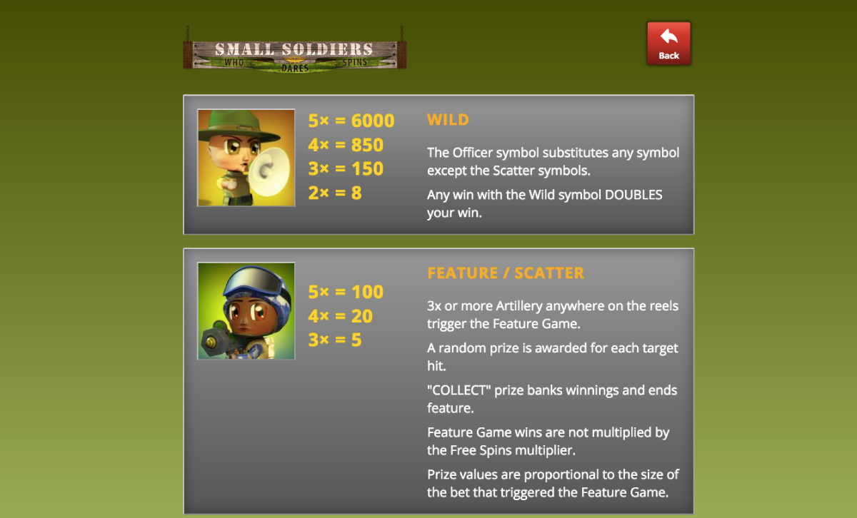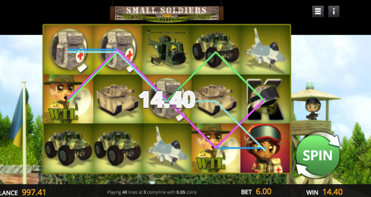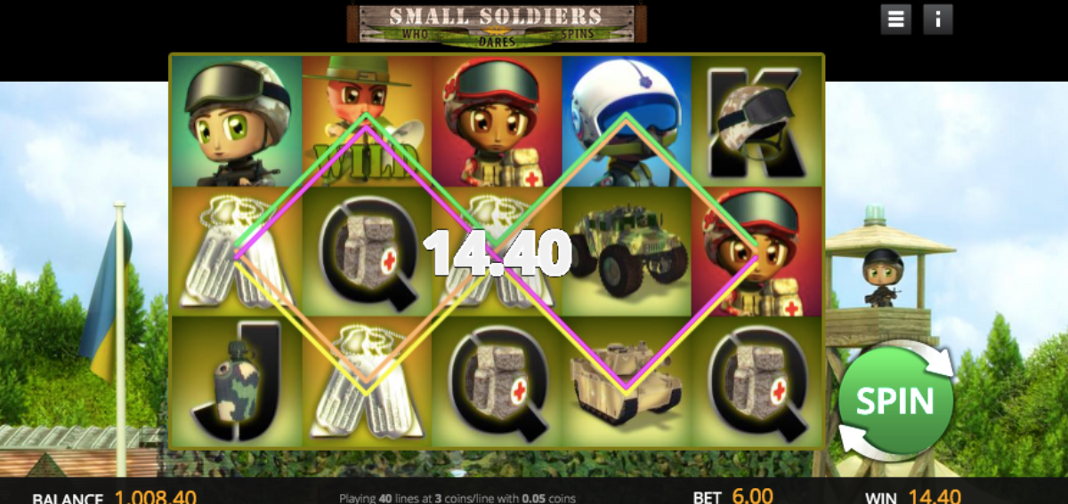 The motto in Small Soldiers is “who dare spins, ” and the people that have been spinning the reels have been making bank. Enjoy seeing a military training facility themed slot game that has rugged little American soldier running around fighting to help you win the grand prize jackpot.