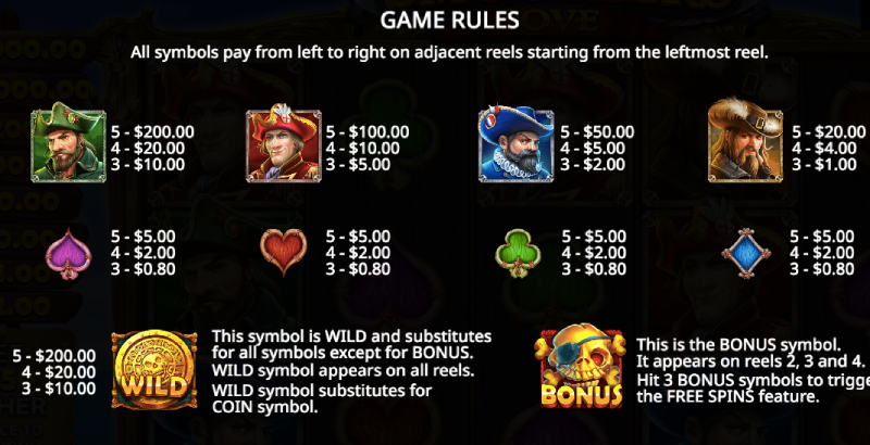 The reward for playing is from scatter wins, but people can get a reward if symbols land in combinations of three to five. The lower value ones are diamonds, spades, hearts and clubs. The higher value ones are golden, blue, red and green pirates/smugglers. You can win a lot of money when you get five symbols in a row. You can earn a lot of money if you get the best symbols. One symbol is worth the same as the top symbol and also replaces any other regular symbols to complete a line win.