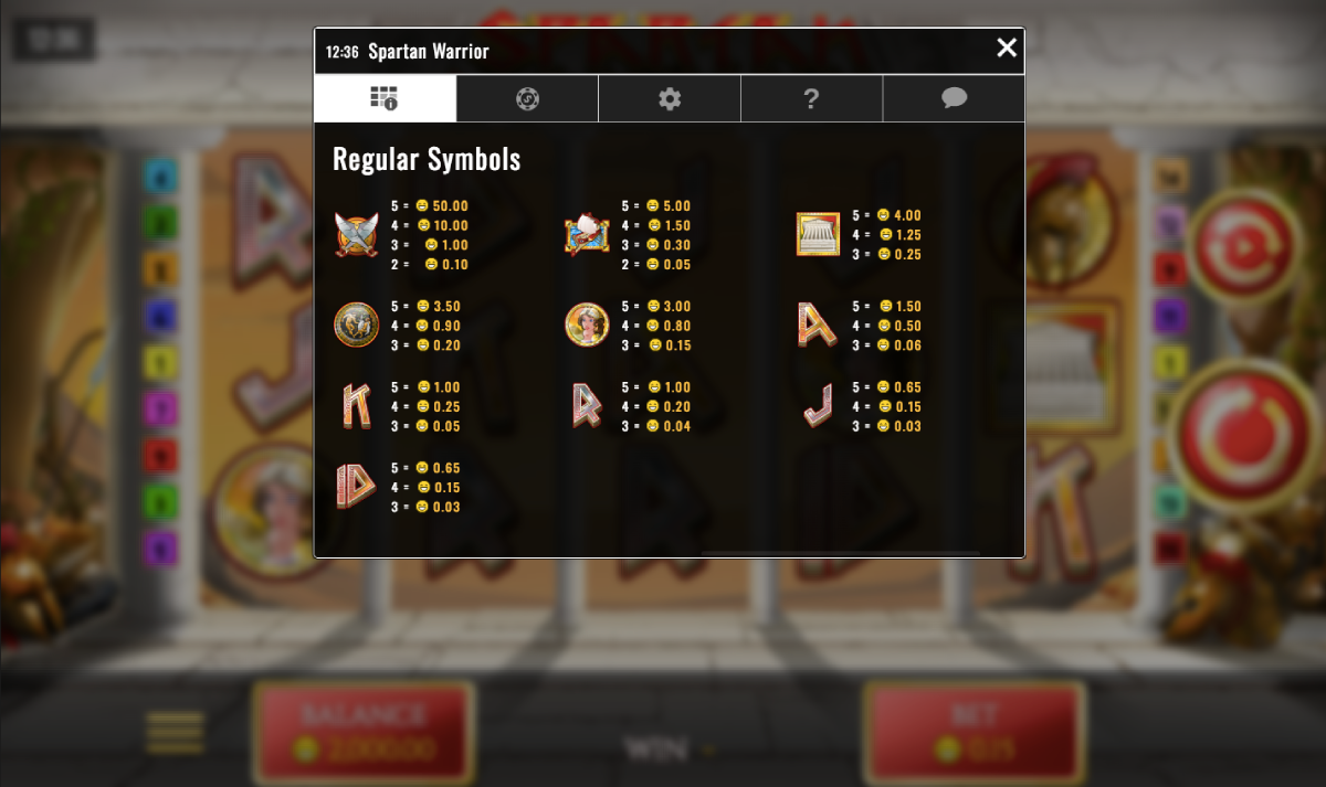 The symbols you will see when playing Spartan Warrior are indicative to the battle between the Spartan Warrior Achilles and the Trojan Prince Hector. You will see the Spartan Shields, Wild Swords, beautiful Briseis and the ships that the Spartans used.