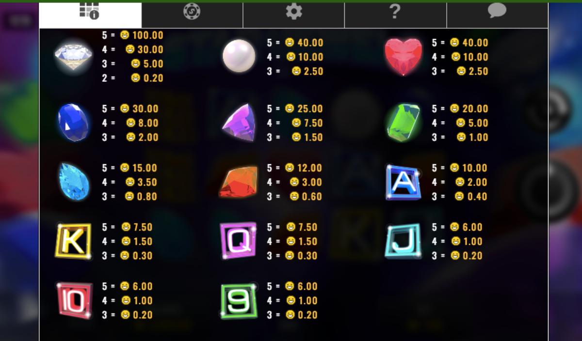 There are jewel symbols that have different colors and values. You will see the red, purple, green and blue jewels on the reels. There are also other icons called the “specials.” The special symbols are the diamond, the pearl, the heart and the blue sapphire.