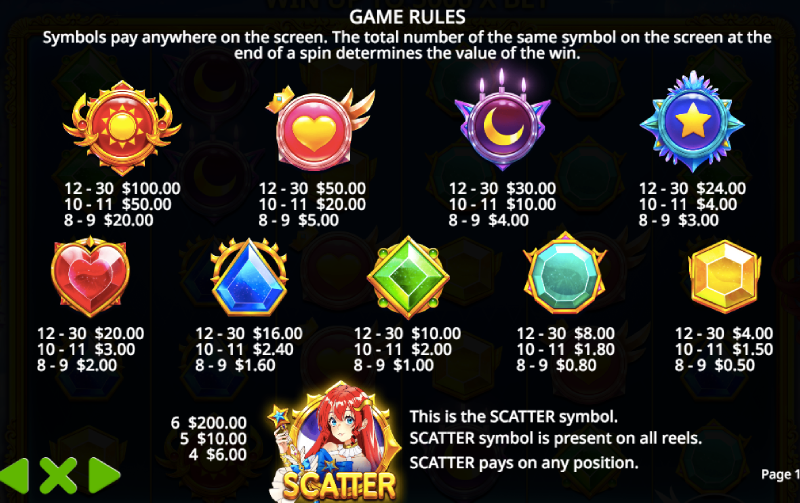 Some Pragmatic Play games are different from other games. For example, they do not use paylines. Basically, there are no prizes for winning lines of symbols because you win by getting at least 8 matching symbols in your view.The first five symbols are gems with shapes. There are four symbols with stars, moons, hearts, and suns on them. The payout value for 12 of the 4 higher-valued symbols ranges from 12 to 50 times the stake. Starlight Princess does have wild symbols too – that could be messy.