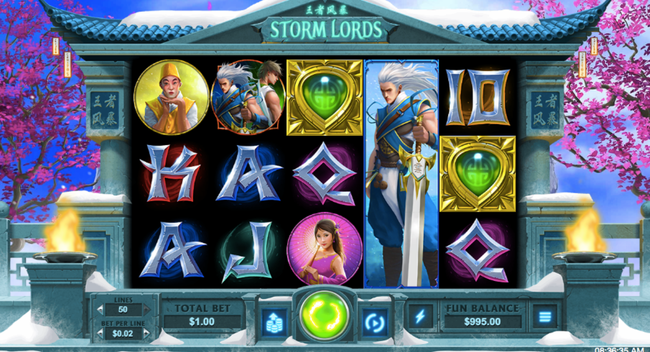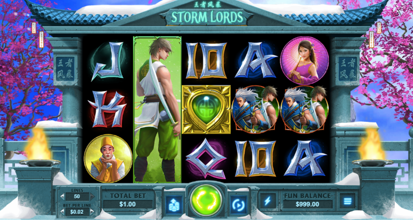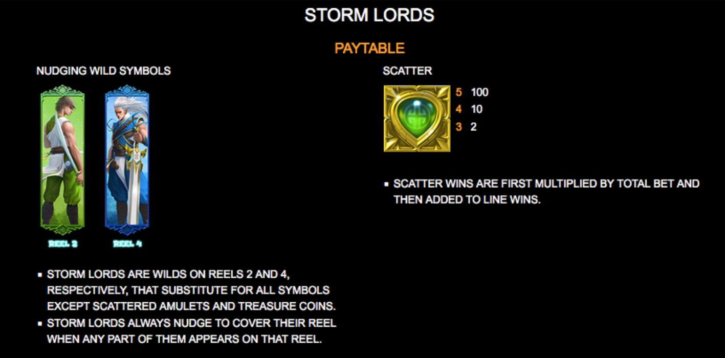 Building on the fantasy and adventure theme, Storm Lords tells a story as the adventure unfolds. Each symbol and game icon has been designed to enhance the theme. From playing cards from nine through Ace as well as Amulets, they all help tell the tale. The central characters, Storm and Wind perfectly fit the vision of a fabled Chinese warrior.