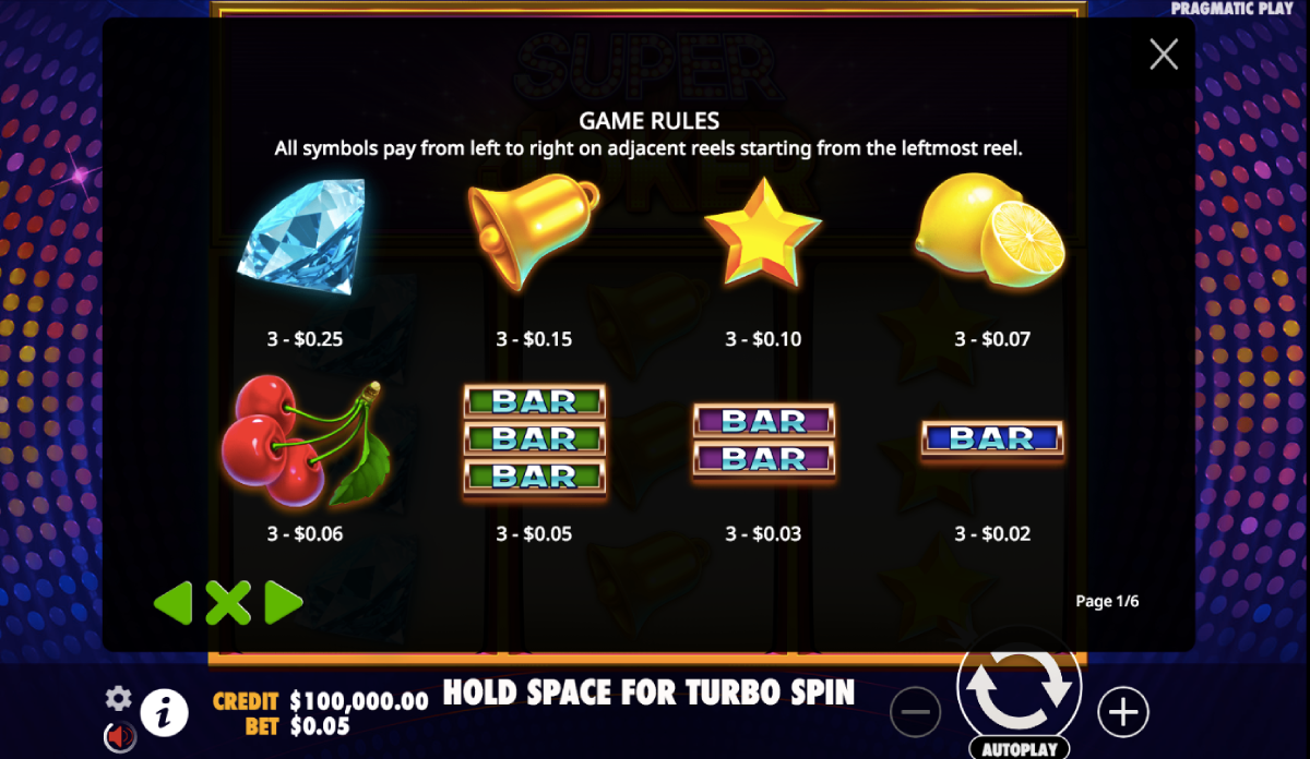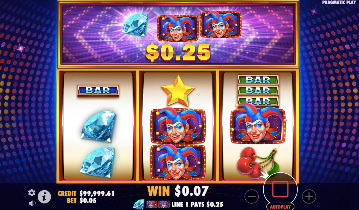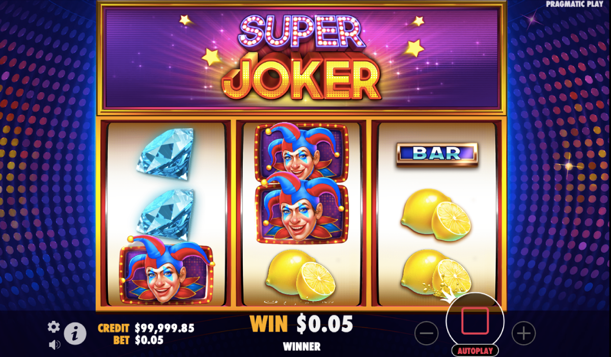 Before you start to play Super Joker, you should understand that this game is pretty basic. With a name like “Super Joker”, you are probably expecting a video poker machine. And guess what? It is pretty close, but it has some fruit symbols mixed in with the joker poker playing card icons. That said, Pragmatic Play did a great job with the graphics. As you look at the backdrop, you will see a disco ball and hear an upbeat soundtrack. While some fruit slot machines are boring, we found that this electronic gambling game is actually pretty fun. Additionally, there are some big wins you can score.