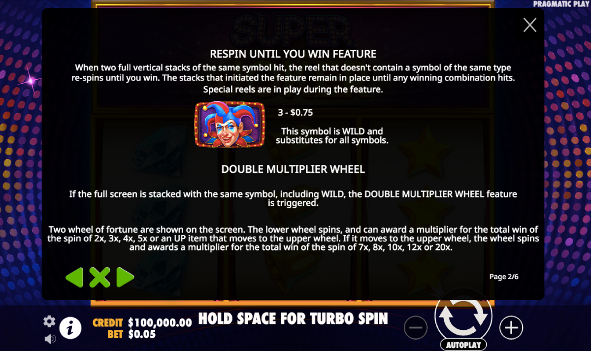 Super Joker comes with three reels and five pay lines. However, it is a very fast paced, and volitale game that offers some nice features. Furthermore, keep your eyes peeled to land two or more fully stacked symbols on the same wheel. As a result, you will trigger the Respin Until You Win feature that comes with a Double Multiplier Wheel. You can increase your betting bankroll up to 1,500X when you score this Double Multiplier Wheel feature.