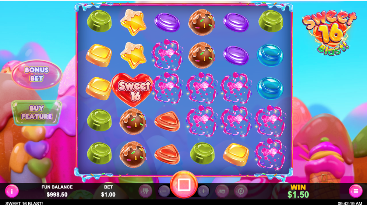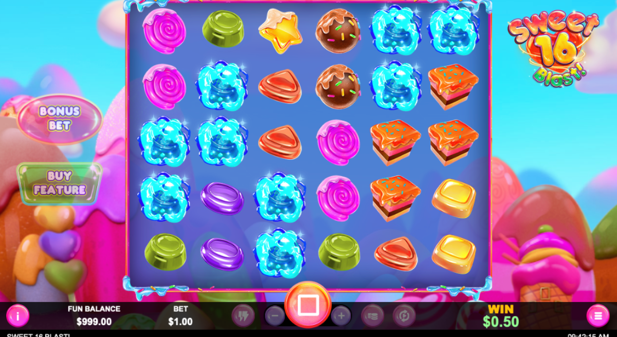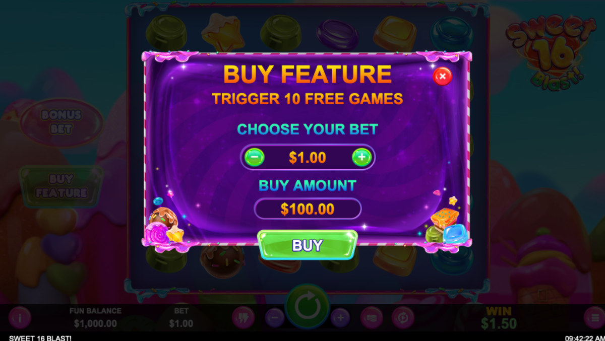 Discover cakes, chocolates, gummy bears, lollipops, and other sweet delights.There is a Free Spins Counter as well as Cascading Wins on the left side of the screen. During the game, players will see the Bonus Bet and Buy Feature to the left as well.