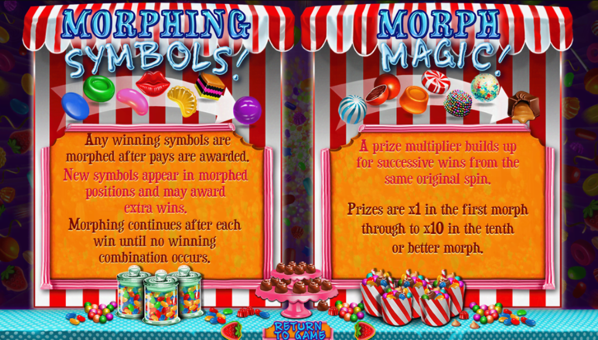 During the base game as well as during free spins, all symbols part of a winning combination morphs to new positions to increase payout multipliers. This feature is called Morph Magic. With each consecutive win, the multiplier bar on the top of the screen increases from between 1x and 10x during base games and between 2x and 20x during free spins. If you like this slot machine, try Sweet Treats.