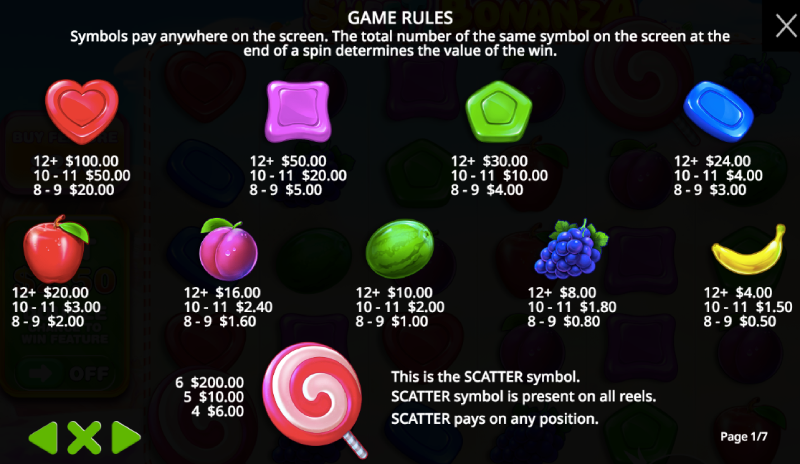 The heart candy is the most generous regular symbol in the game: it pays out a prize equivalent to 50x your stake when 12 of them appear on the reels. It pays out a prize up to 25x for ten or eleven symbols, and 10x for 8 or 9 symbols.
