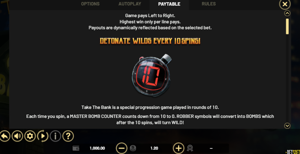 In conclusion, Take the Bank is an explosive online slot game. The real innovation and highlight is the countdown over each series of ten spins. Also, players can anticipate the arrival of each bank robber. Filling the reels with bombs give guaranteed wins.