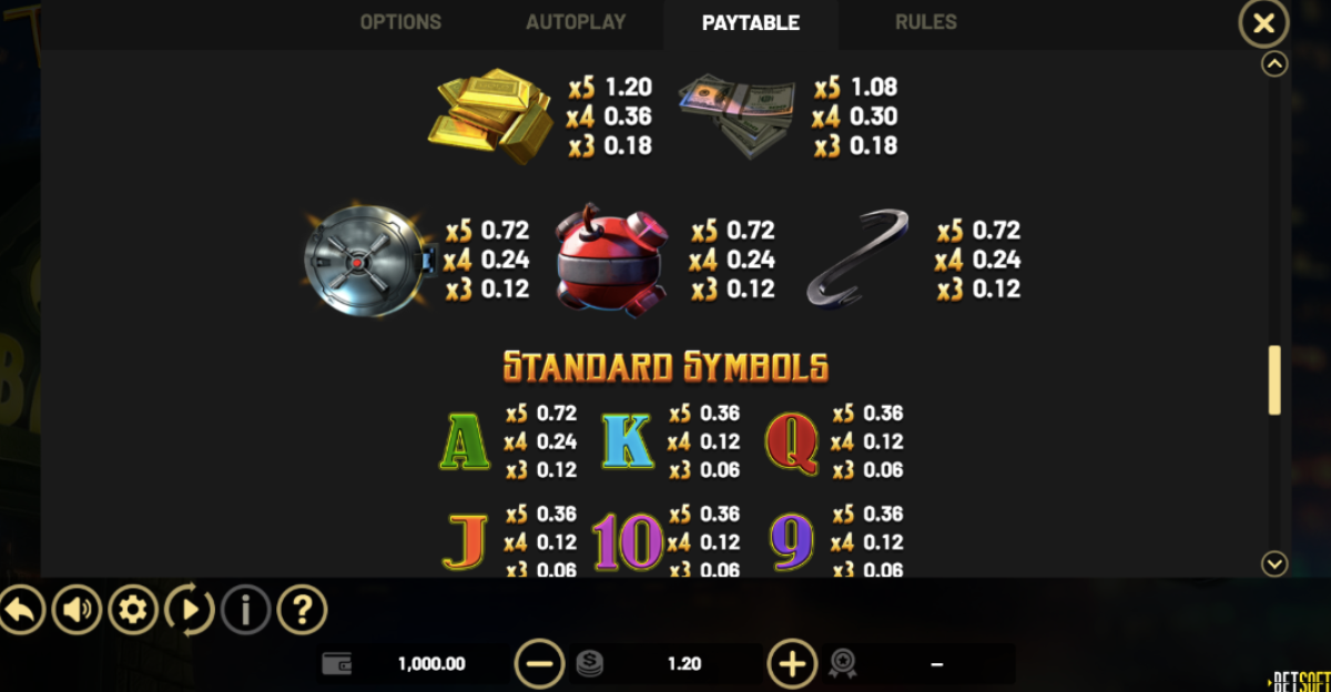 Winning in Take the Bank slot game requires finding a matching combination of various symbols. Symbols such as a red bomb, the prybar, as well as the vault door, each pay up to 60 coins, once you fill a single payline with any of these matching symbols.