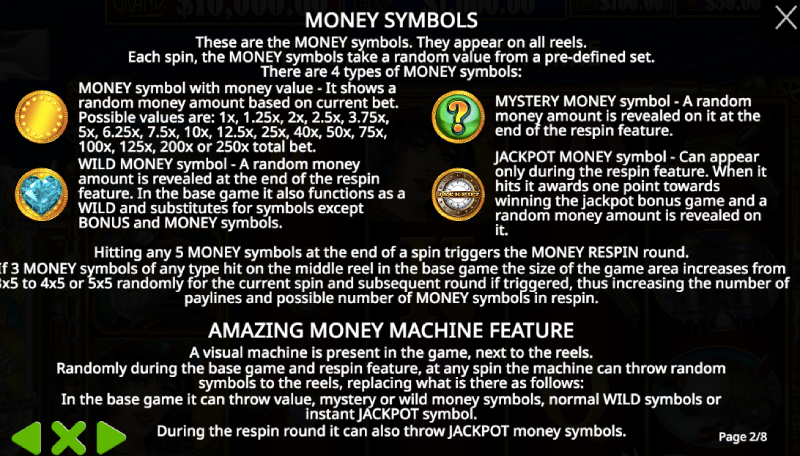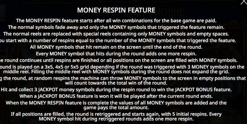 As mentioned, reels will not switch format on 3Ă—5, 4Ă—5 or 5Ă—5 layouts if a player arrives during the Money Respins reel bonus round. This is bad news. The Amazing Money Machine on the left side of screen is active and available during these time periods to help with prizes.It can place Money Symbols in empty cells, helping you fill the screen with Money Symbols.