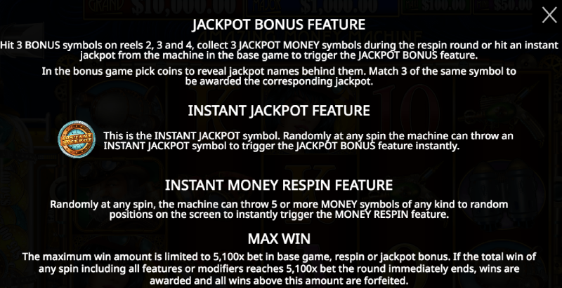 This feature is credited with adding some randomness to the game. When this occurs, The Money Machine replaces the symbols already on the grid and sometimes includes specific tiles, depending on what options are active.