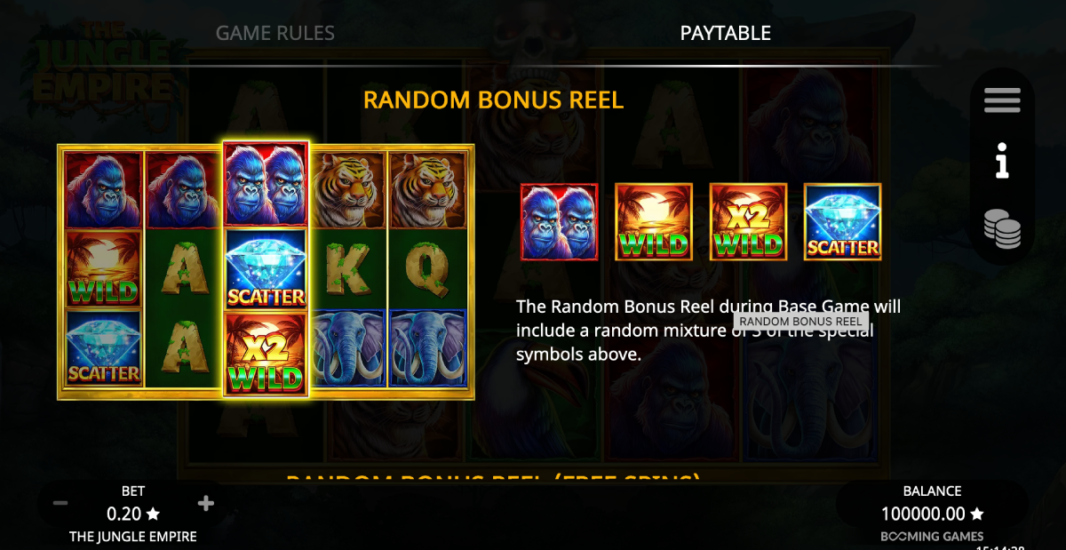 During the base game and free spins, there is a chance that the Random Bonus Reel may land on reel 3. This reel has double symbols of the highest paying symbol, Wilds, multiplying Wilds, and free spin Scatters. In free spins, it can also award additional spins.