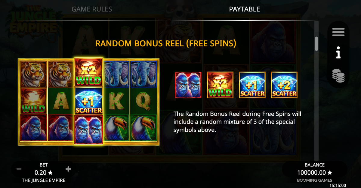 The Jungle Empire game was developed by Booming Games using HTML5 technology, which allows it to be played on desktops, mobile devices, and tablets. You can play the game with just an internet-ready web browser.