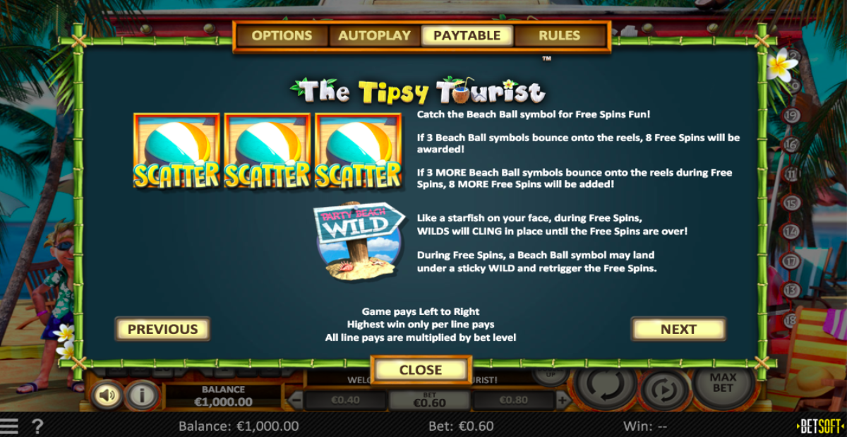 The introduction to Tipsy Tourist is spectacular and describes what the slot machine is. The graphics are three-dimensional, and once you start playing the game, you will see some beautiful animations, a great soundtrack plus an unusual background filled with colors and animations to go.