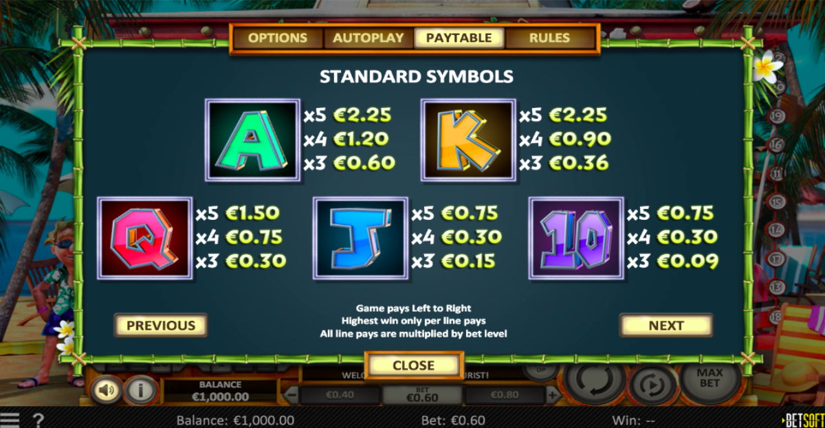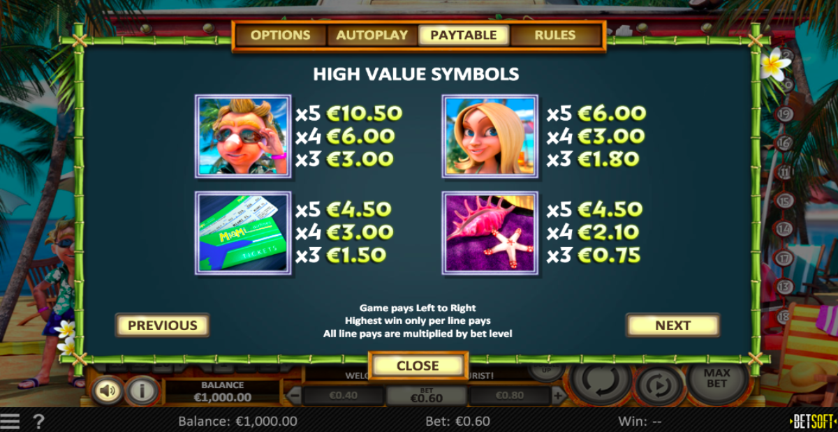The symbols that you will see on the reels are indicative of the theme which is a guy on vacation have fun and drinking a lot.
