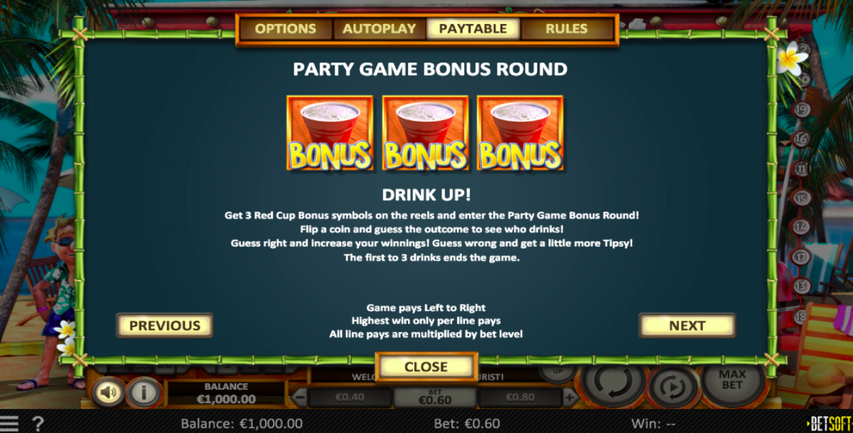 When you land a red cup bonus symbol on the first, the second and the third reels you will automatically trigger the drinking bonus game. This part is a flip a coin type of bonus game where you can double your wins very quickly.