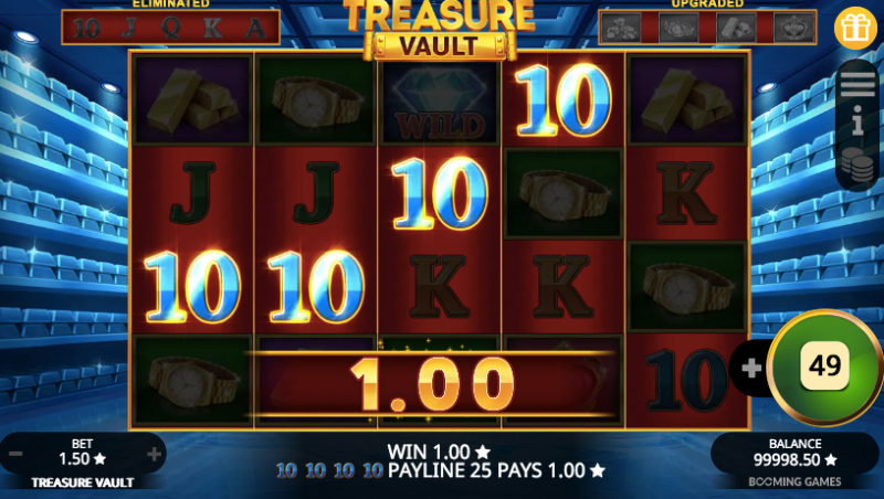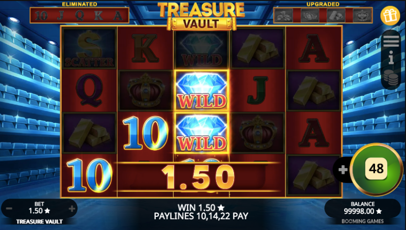 Play the Treasure Vault slot demo for free, read a review, and claim a bonus to experience the Stacked Wilds, random Cash Collect feature, and lucrative Free Spins bonus that can help you win up to 8,000x your bet. This exciting game from Booming Games allows you to rob a bank and try to escape with big rewards!