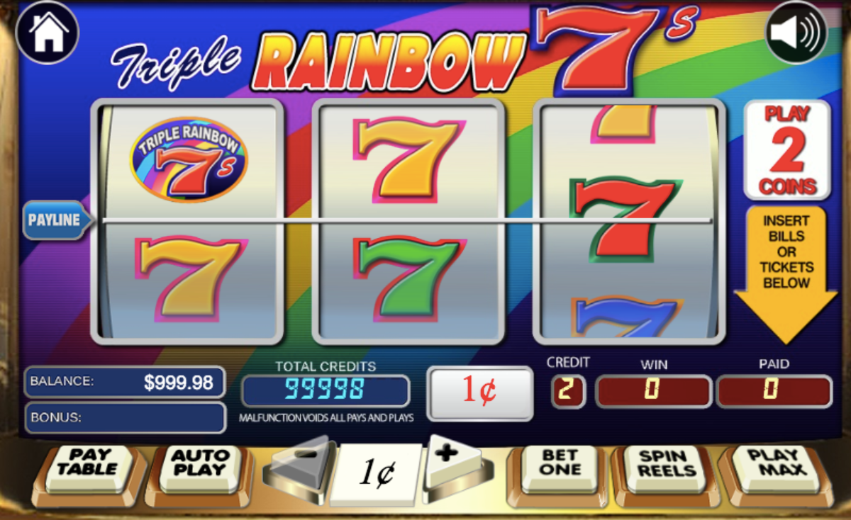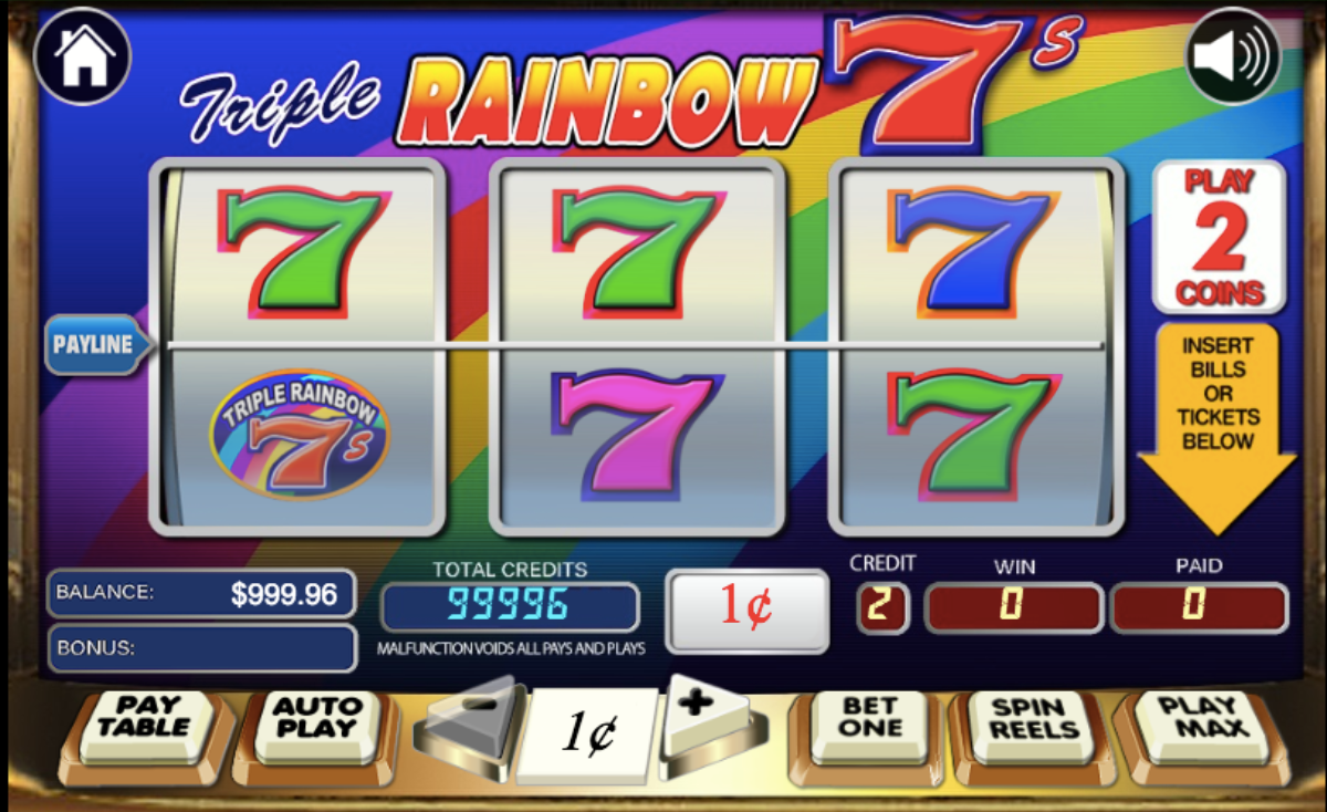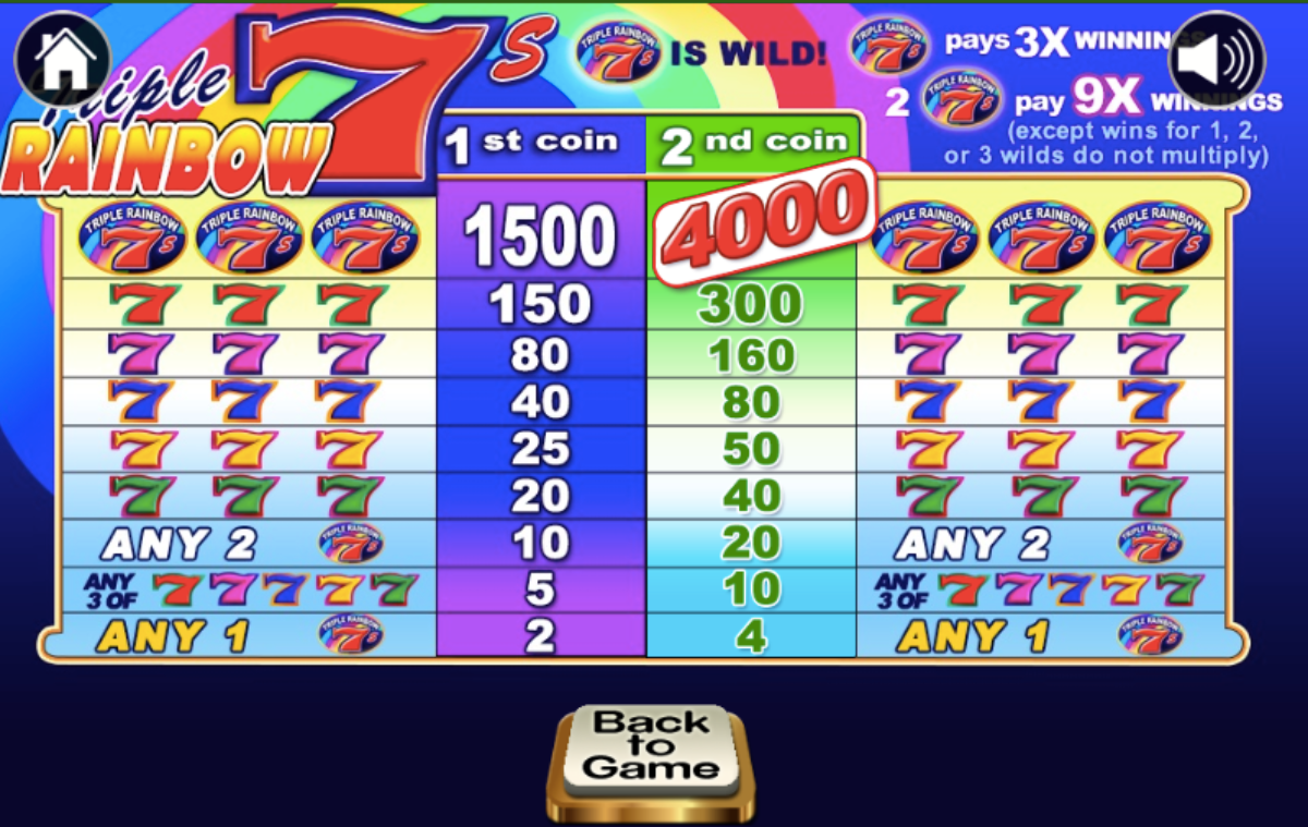 The Rainbow 7 is the wild and will substitute for all the other icons to help you put together a better combination. The rainbow seven also acts as a 3X and 9 X multiplier on all pay lines. Win the 4,000 fixed coin jackpot by betting two coins and hitting three Triple Rainbow 7’s.