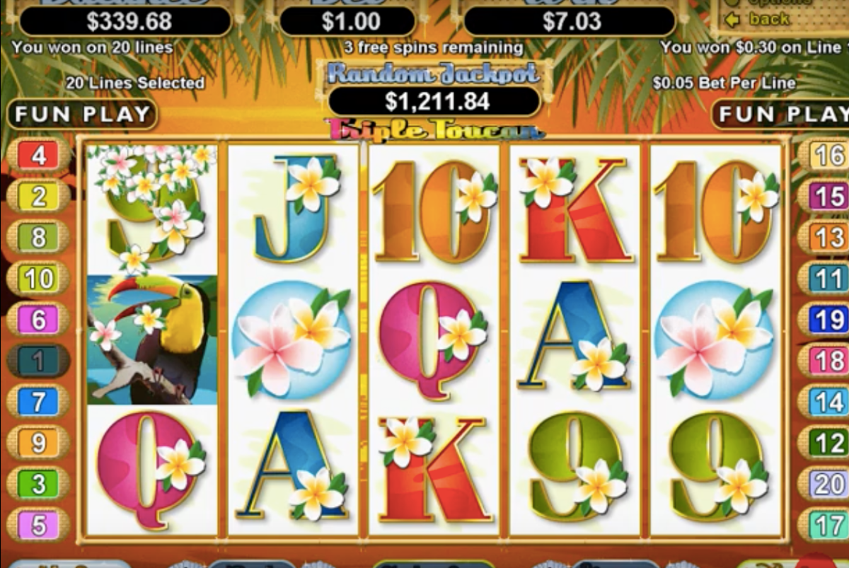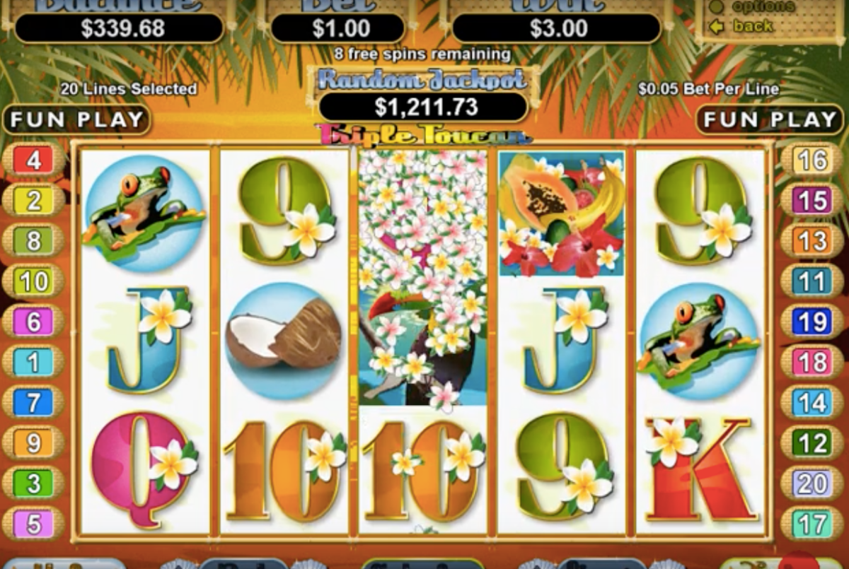 Are you ready to enjoy the tropical paradise where you can see beautiful animals and plants on your computer or phone with this five reel 20-pay line video slot game? Real time Gaming software powers the Triple Toucan that could be played online  or using your mobile smartphone.Triple Toucan is an animal themed game that features a random jackpot, triple winning payouts free spins, scattered wins and bonus rounds.