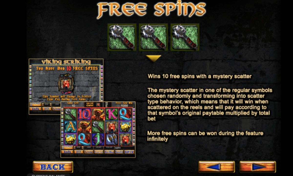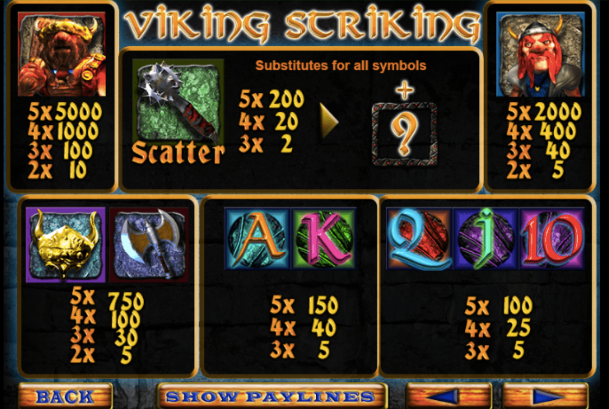 There are 35 winning combinations in this game that feature a scatter symbols and the wild symbol. The symbols you will see on the Viking & Striking reels are the Long Ship (scatter icon), Shield (wild symbol), Vikings, Horned Helmet, Sword, Club, Hammer, and the Axe.