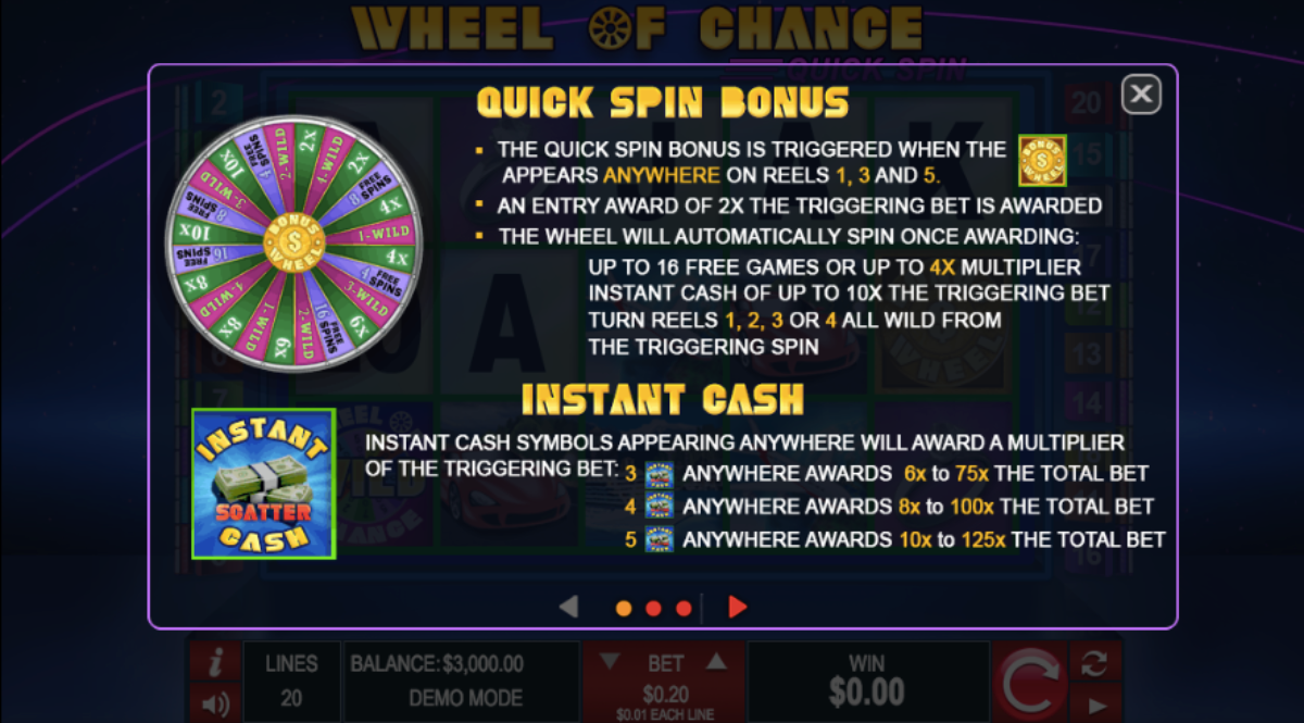 To trigger the Spin the Wheel Bonus Round, spin in three or more of the Bonus Wheel Icons and you’ll be transported to a world full of possibilities with a chance to win big at the Wheel of Cash!