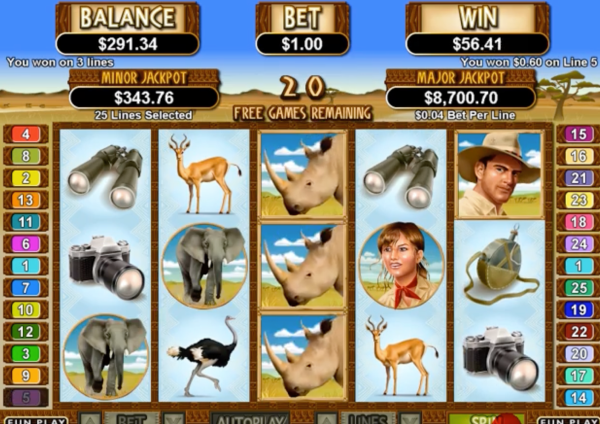 The White Rhino slot machine has five reels with twenty-five pay lines. Realtime Gaming (RTG) casino software powers this African safari themed video slot game. White Rhino features a progressive jackpot, scatter wins, a bonus round, free spins and a wild symbol.