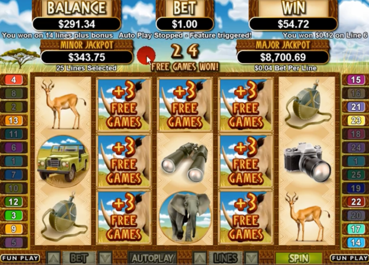 When you trigger the free spins bonus round you will be awarded the free game per White Rhino that you landed. For instance, if you landed three scatter icons you will get three free games, land four of the scatter symbols and get four free games and so on.